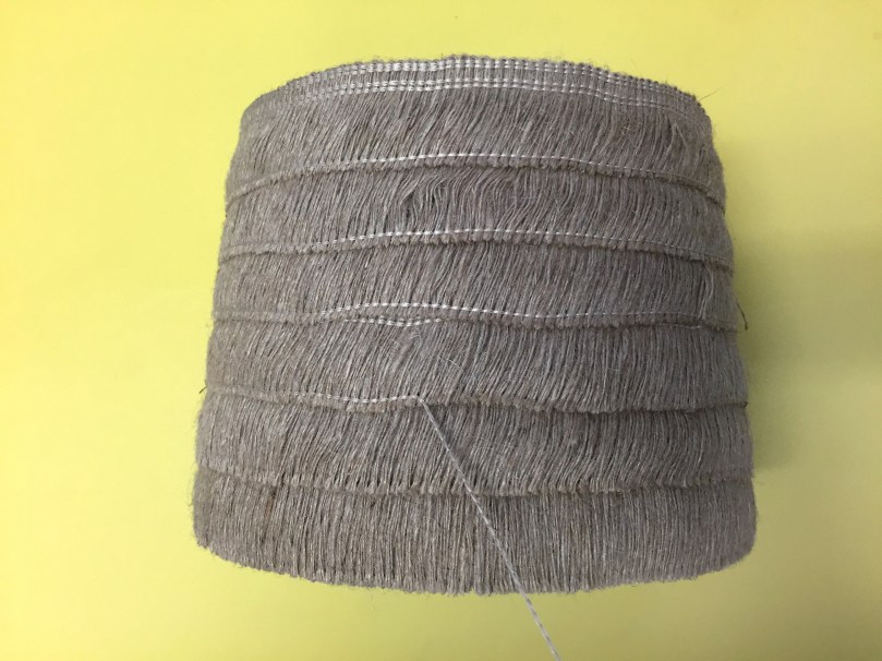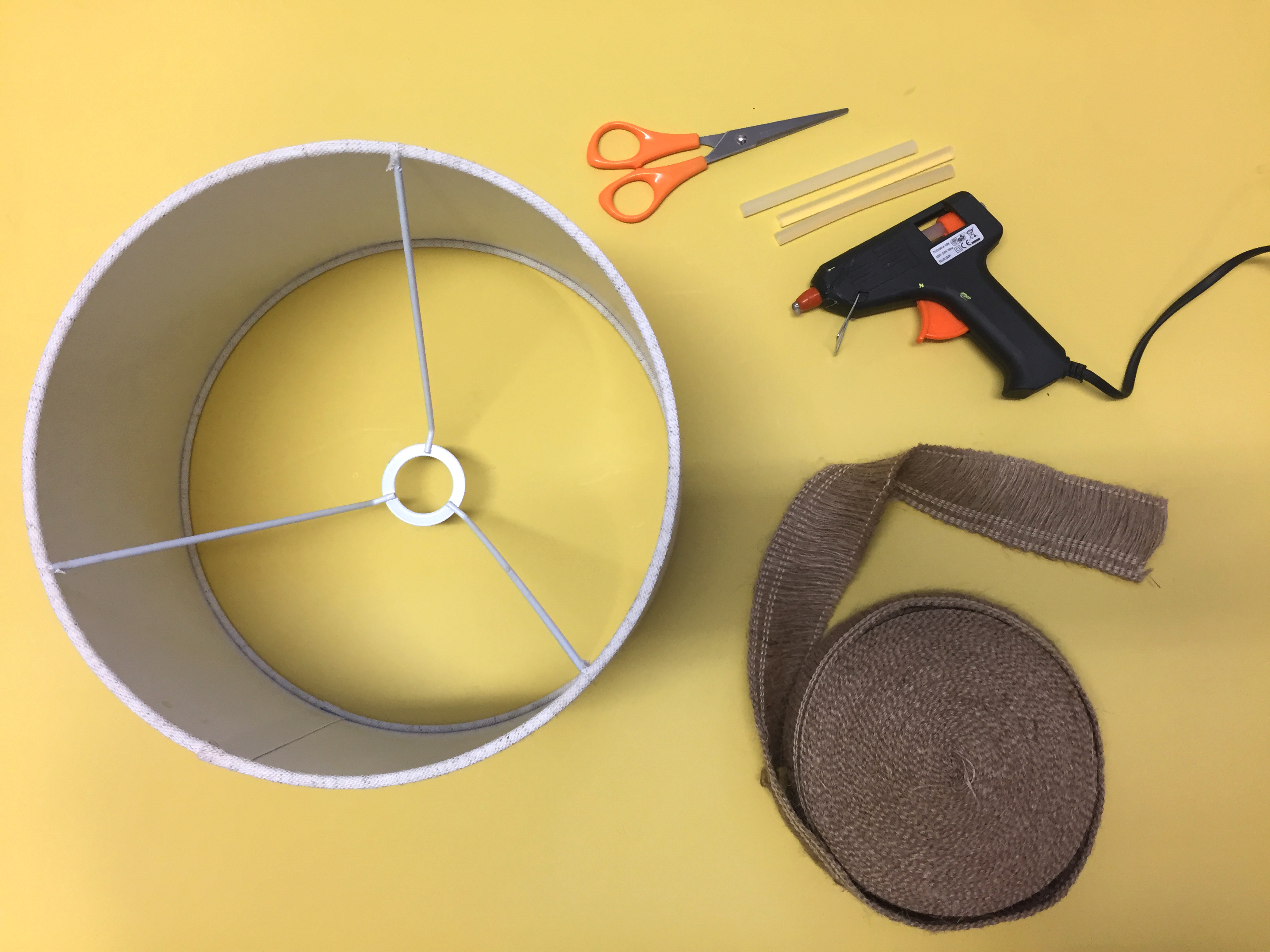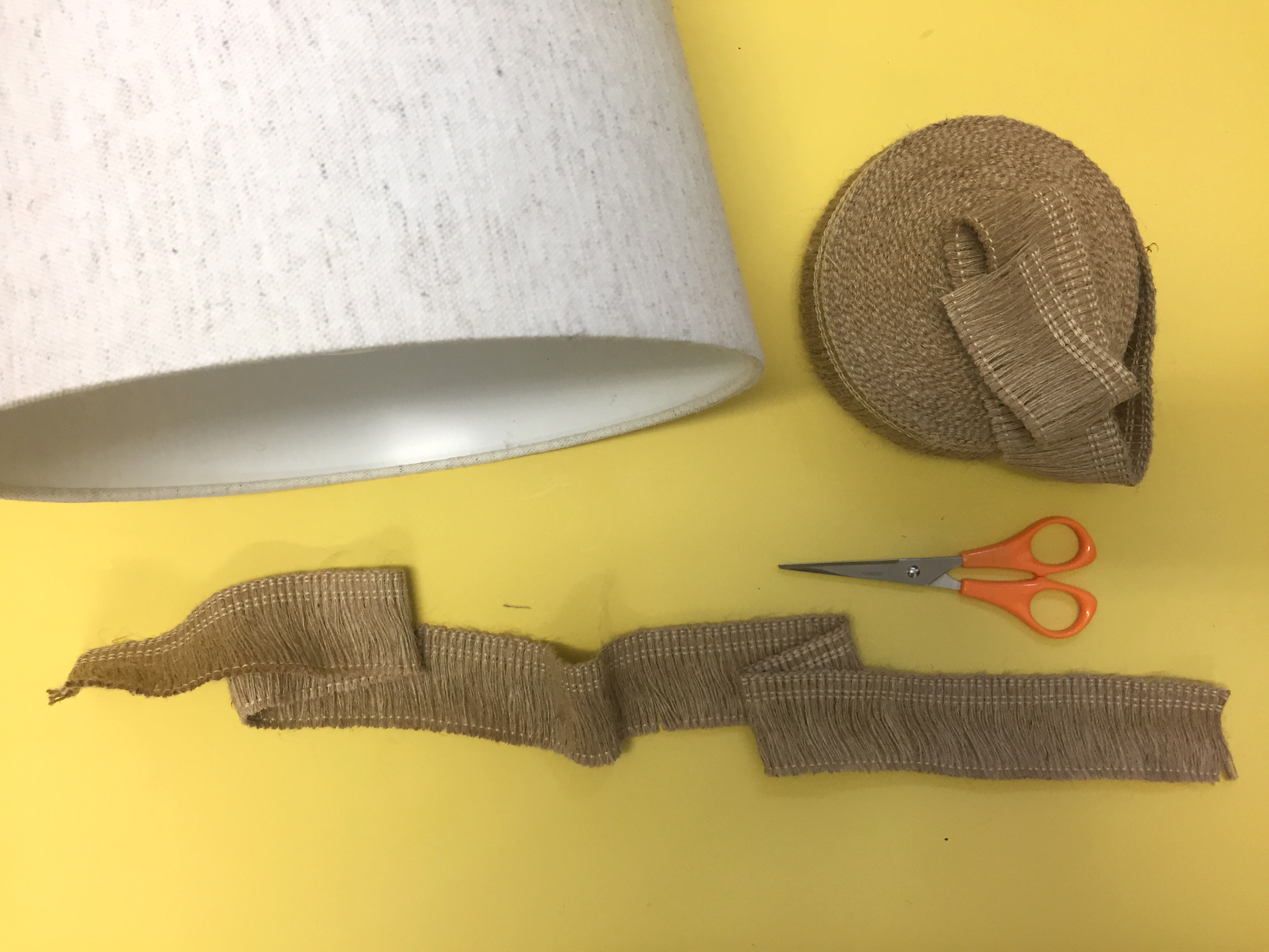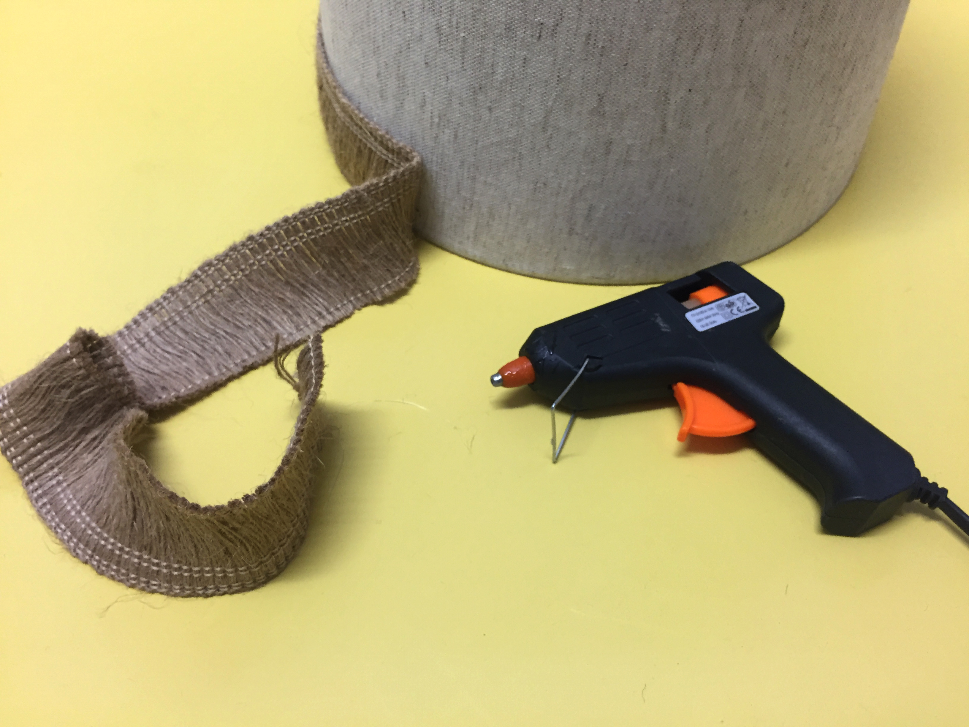 1.Wrap the fringed hessian round the base of the shade and add an extra centimeter and then cut.