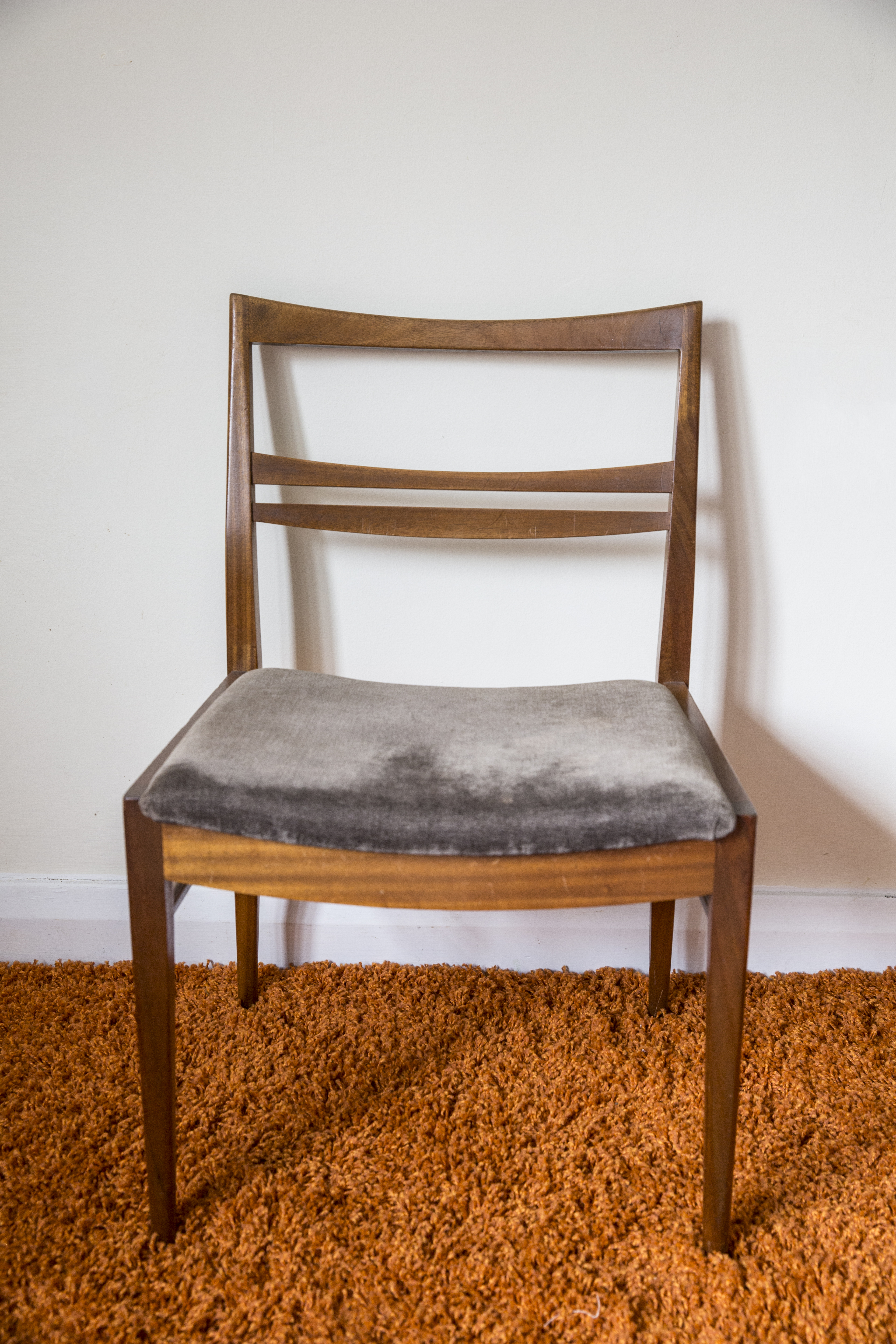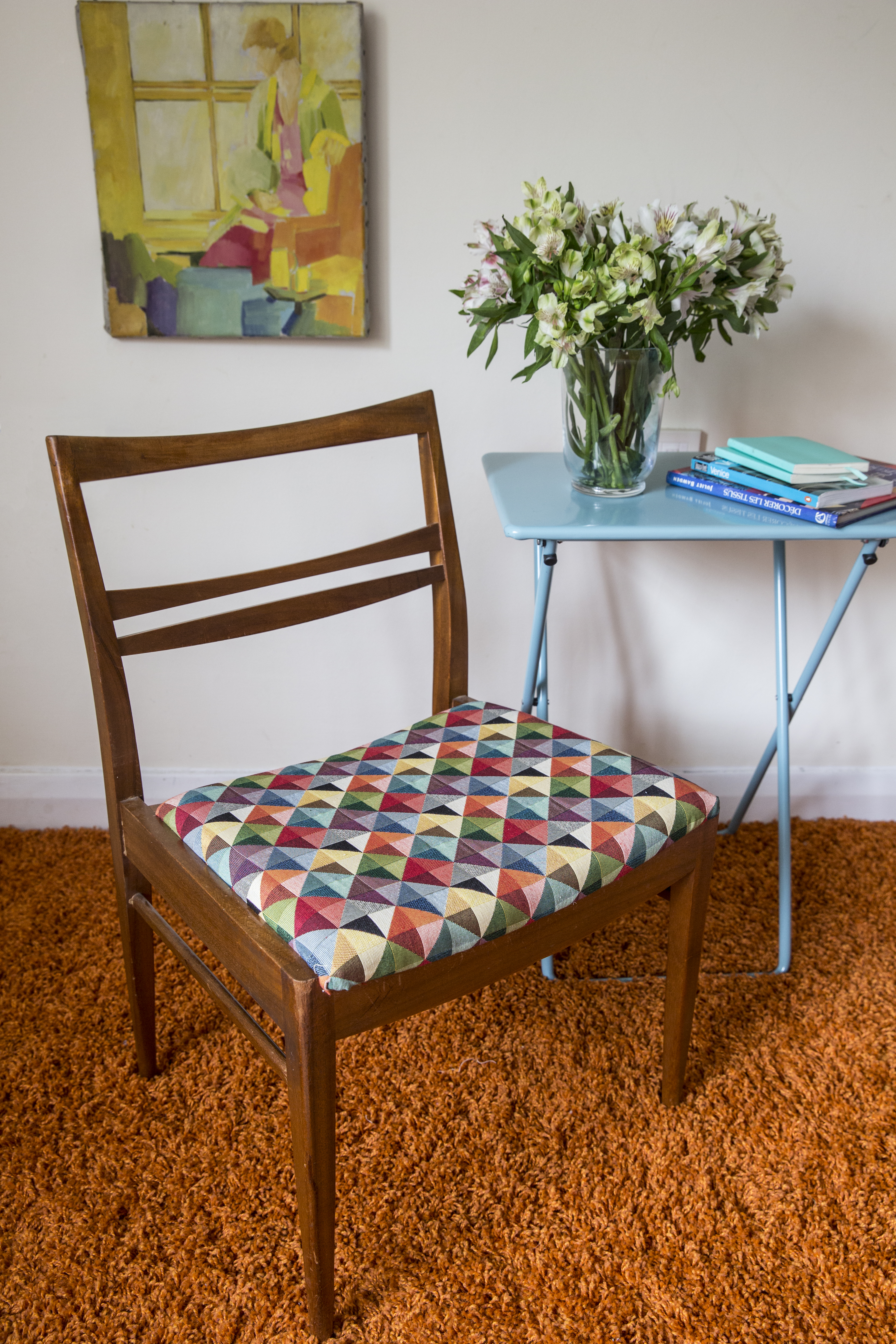 I was lucky enough to find a couple of mid century modern dining chairs on ebay, but the covers were dull as ditchwater and needed replacing. I found a great upholstery fabric at https://www.craftysewer.com/ that gives more than a nod to mid century. I loved the colours on the underside of the fabric so I have used it reverse side up.