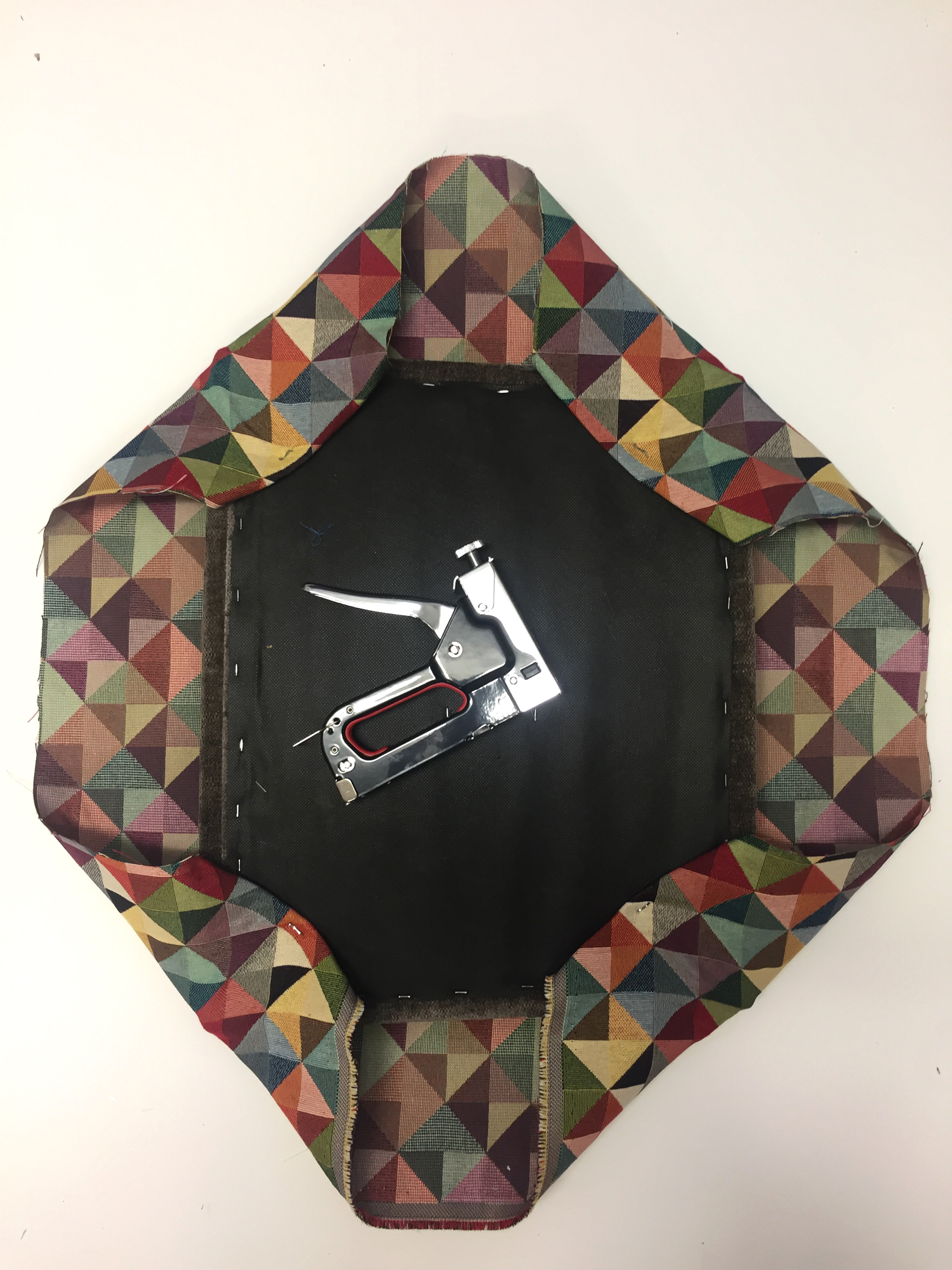 Fold and turn the edge fabric over each side of the chair and staple into position. Screw the newly covered seat back onto the chair.