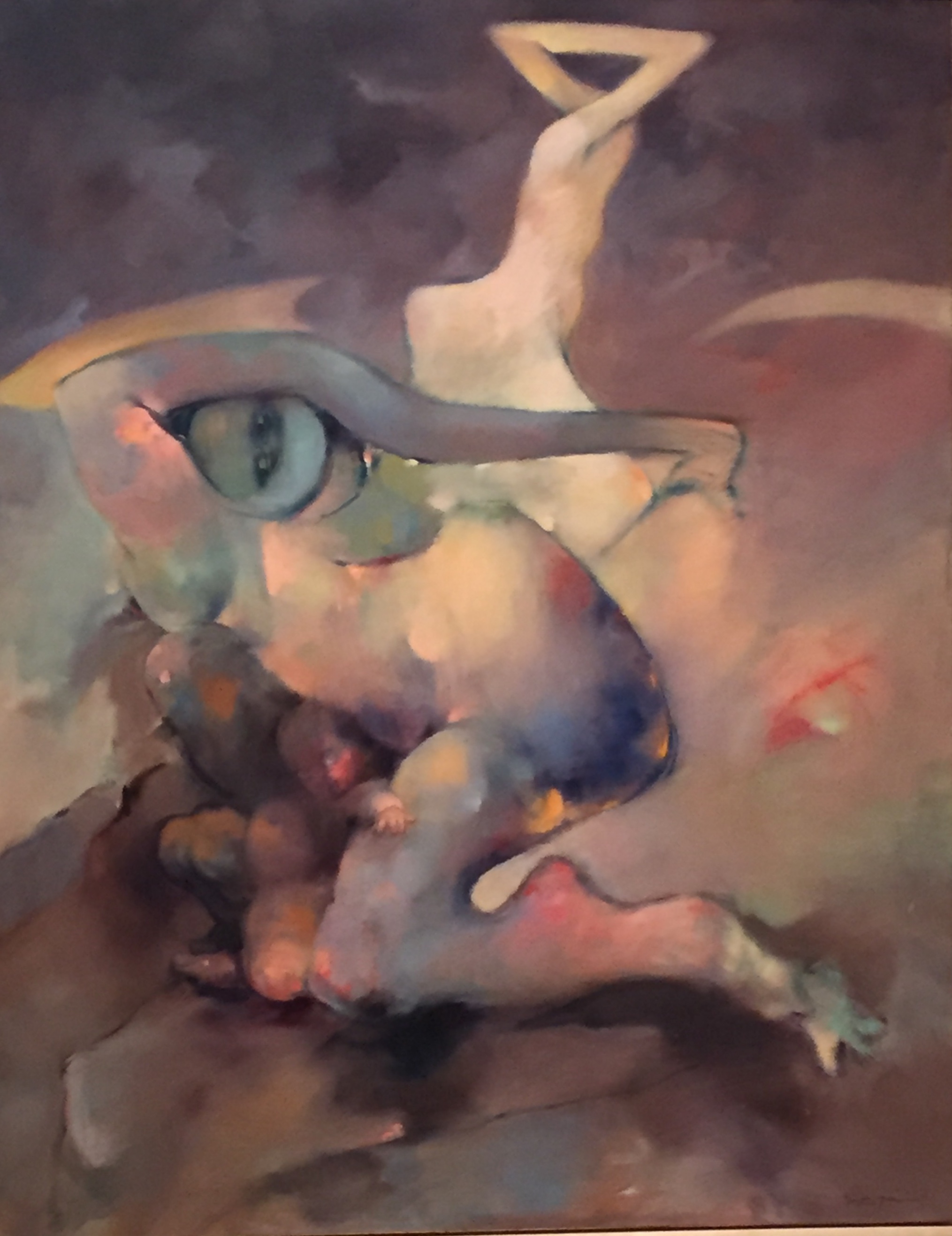 In the 1950’s and 60’s Tanning moved away from Surrealism towards abstraction. Her paintings showed entwined figures which appear to loom out of a blue grey fog.