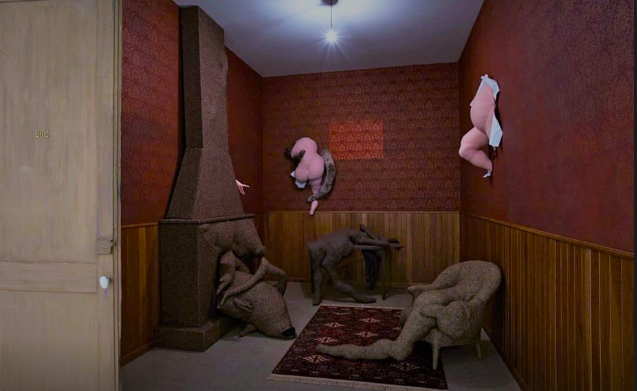 The last section of the exhibition shows Tanning’s move into soft sculpture. It is important to remember that she was a pioneer in this method of creativity way ahead of her time and prefiguring the work of Sarah Lucas and Louise Bourgeois. The Installation Hotel du Pavot : chamber 202, is magnificent and shocking all at the same time with its organic shaped forms, bodies?, bursting through the walls.