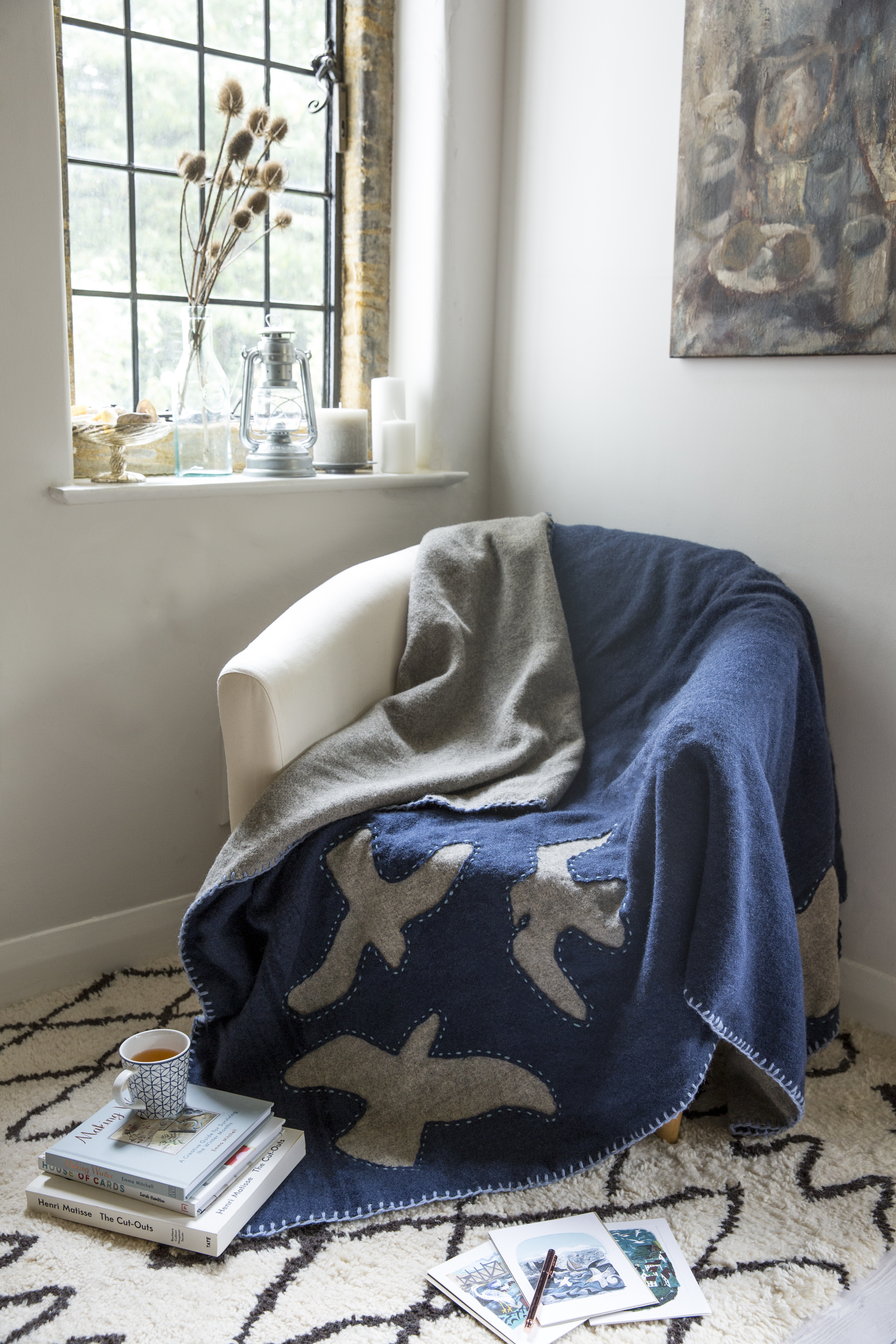 Those who live on the Coast are probably more aware than most, of the changing seasons. The skies are overcast and dark, the sea becomes rough and the sea gulls soar and wheel on the updrafts. With this image in mind I have designed an appliqued blanket. I have kept with the dark almost monochrome, but with suggestions of seasonal colours. The method of making is very easy and the end result has a Hygge Scandinavian feel.