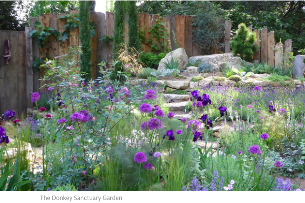 The Donkey Sanctuary Garden celebrated the 50 years of transforming the lives of Donkeys. The designers were Annie Prebensen and Christina Williams.” We have a real fondness and appreciation for these hard The working animals, so were delighted to be asked by The Donkey Sanctury to design an Artisan Garden to explain ‘why donkeys matter’ The garden demonstrates how owning a donkey means access to clean, fresh water for some of the poorest and most vulnerable communities in the world. Set in an arid location a shelter near a well provides some shade. A dripping bucket hangs above the well and colourful planting surrounds it. The planting in the garden includes plants typical of dry regions, including Eryngium bourgatii, Iris germanica and Lavendula angustfolia. The colour palette is claret, purple and silver
