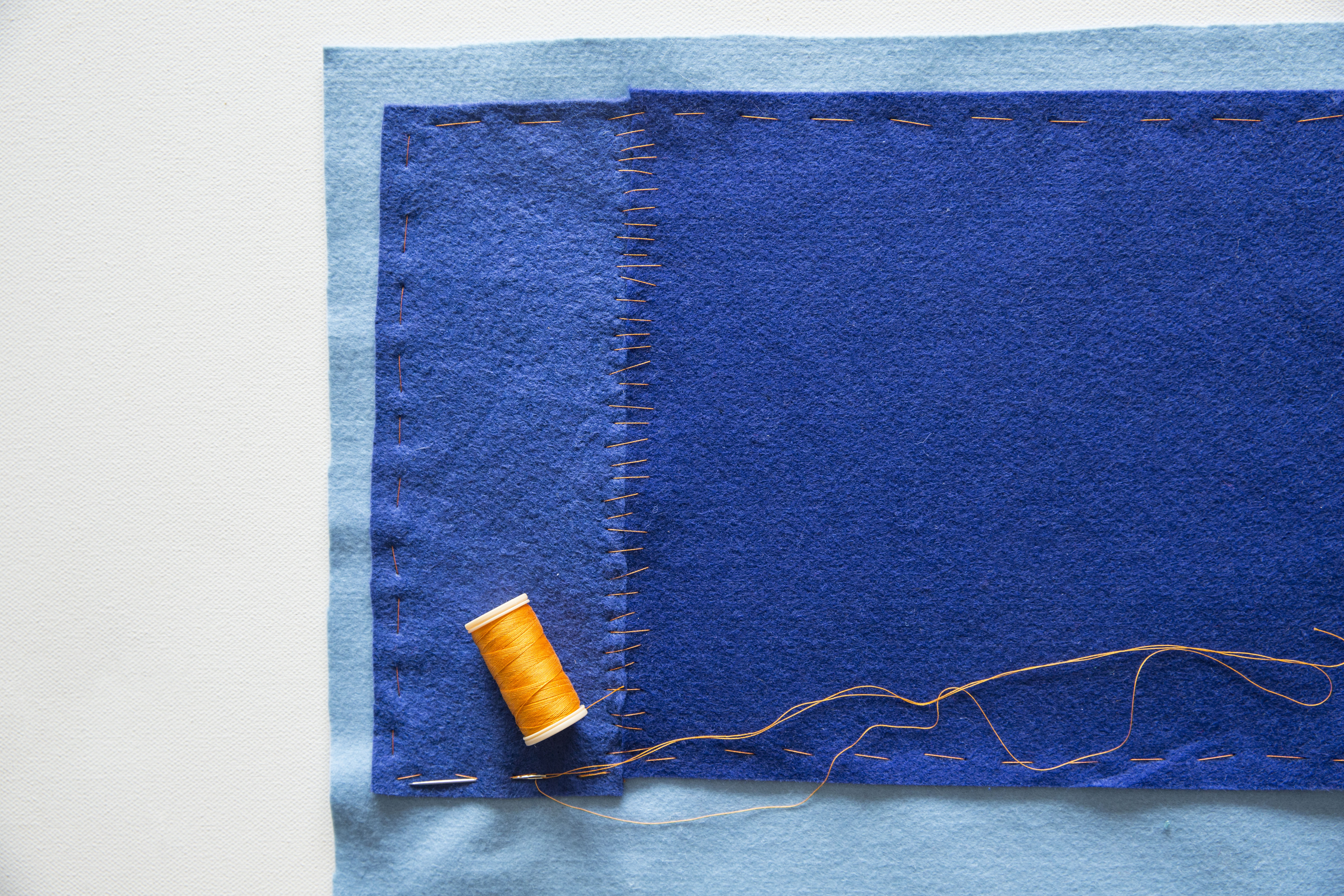 Work on the cushion front, leave a 2 cm border round the edge, and using brightly coloured thread, tack a piece of dark marine blue felt onto another piece and onto the cushion front so it measures 22cm x 32cm