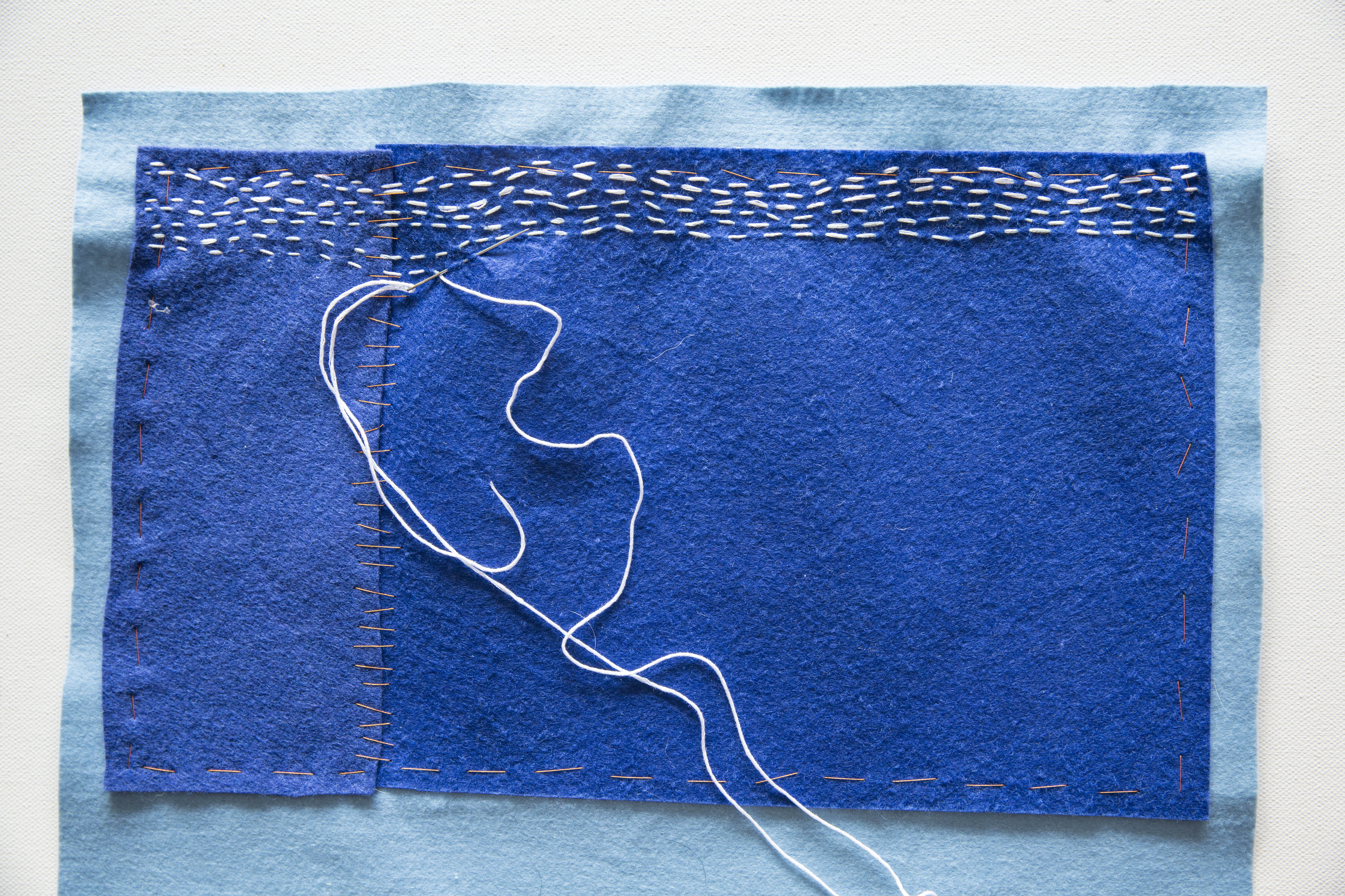 Thread the whole six strands of a piece of white embroidery floss into a tapestry needle and sew random sized running stitches from the left side of the felt to the right and back again, creating 7 uneven rows of stitches. Change colour and sew 7 rows in pale blue.