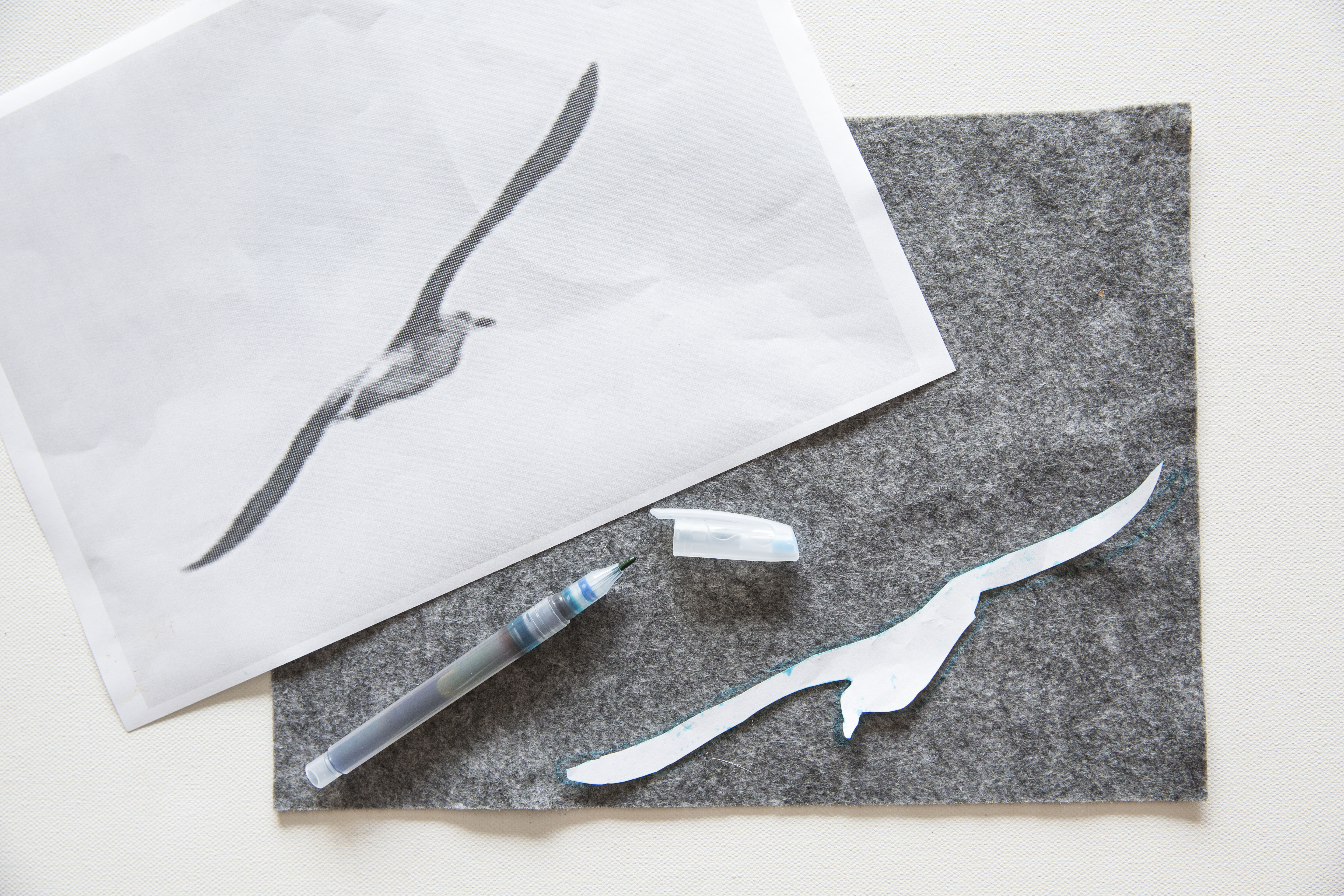 Repeat step 1 using the purple felt. Make sure it joins onto the blue felt and will measure roughly 32cm x 11.5cm. You don’t need to cover the whole of the cushion in stitches, the effect you are after is the waves of the sea. Print images of gulls, draw round and cut out in grey felt.
