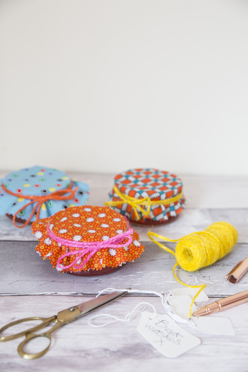 - Make some fabric tops by cutting out circles with pinking shears.