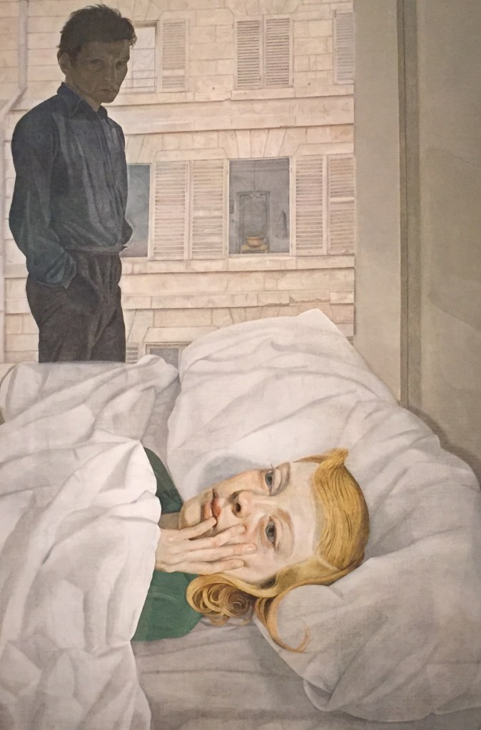 From around the mid 1950’s Freud turned his attention away from drawing to painting, and for a period of about seven years stopped drawing altogether. In order to free up his painting he stopped painting sitting down and from then on painted standing up. His last painting made sitting down is Hotel Bedroom 1954 and is a double portrait of himself and his second wife Lady Caroline Blackwood.