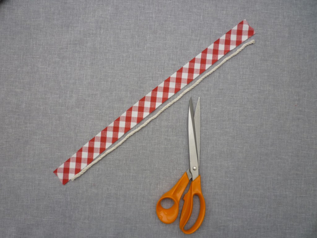 Step 6: Cut a bias strip of the second contrasting fabric, measuring 46cm x 4cm. Cut a 44cm piece of piping cord.
