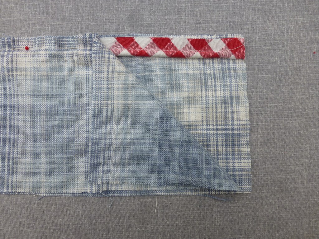 Step 10: To make the loop cut a piece of the second contrasting fabric 20cm x 4cm. Fold in half length ways and sew the long edges together and across one short edge. Trim the seam and turn through.