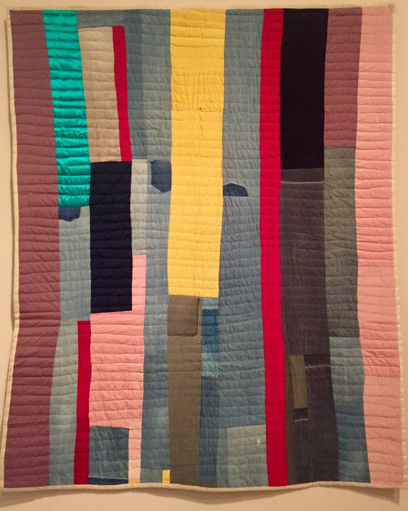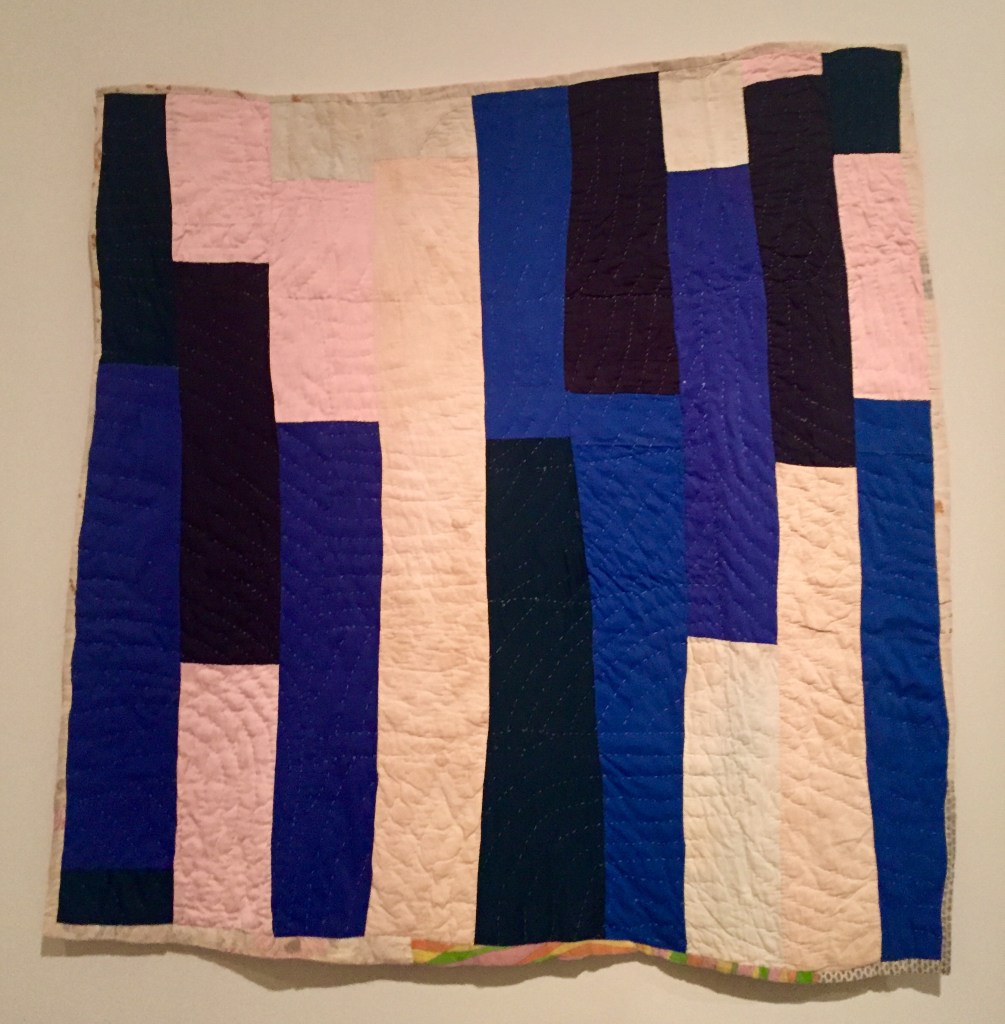 My main purpose for visiting this exhibition was to see the quilts of Gee’s Bend, today known as Boykin. For those who haven’t heard of it, Gee’s Bend is a small community located on a former plantation in Alabama. It lies on a spit of land surrounded by the Alabama River. The deeply rural community has become world famous for their unique hand made quilts created by the women for their own use and gradually recognised and collected by outsiders.