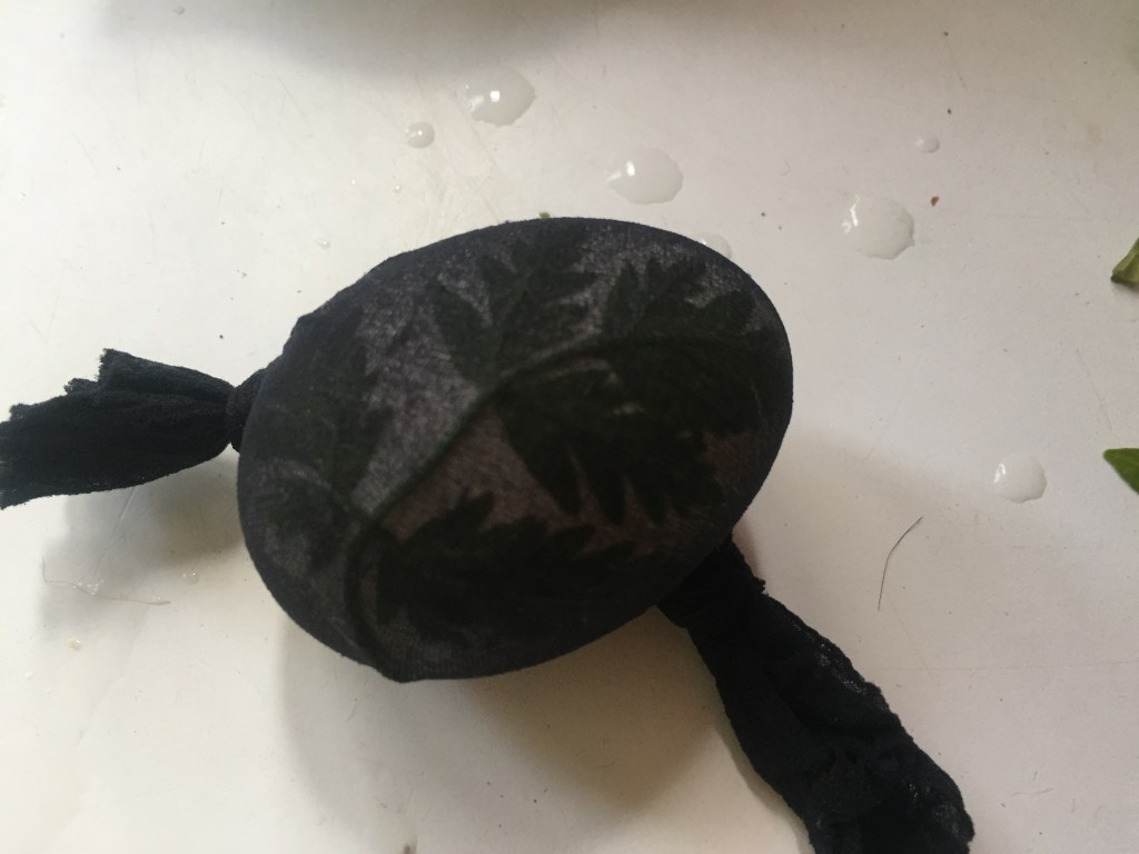 2. Cut a piece of tight, large enough to tie round an egg. Wet a leaf or flower and press it onto the egg. Tie a piece of the tights around the egg, holding the leaf or flower into place.