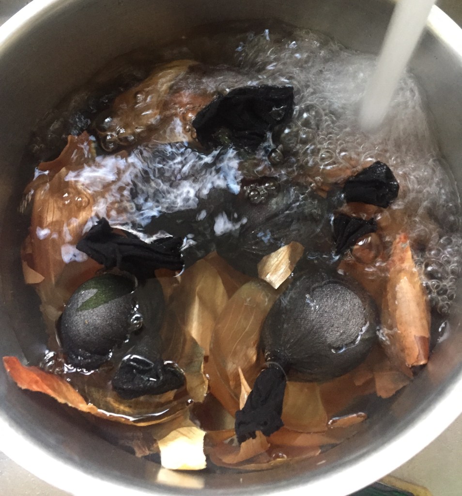 4. Heat the tied eggs, in their dye bath, to a rolling simmer and cook for about half an hour. Leave the wrapped eggs in the water while it cools down. If possible, leave over night or 5 hours before cutting away the tights.