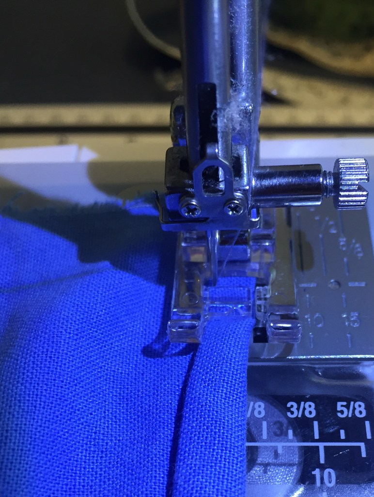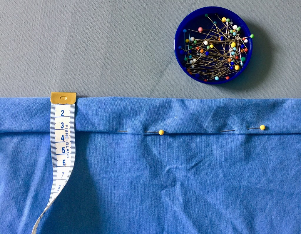 5. Working on one side at a time, fold the top of the casing down by 1cm and then under again by 3cm, pin in place and then sew with a zig zag or running stitch. With right sides together, pin and sew from the casing to where the fold is at the bottom of the fabric. Do this on both sides, to create a bag.