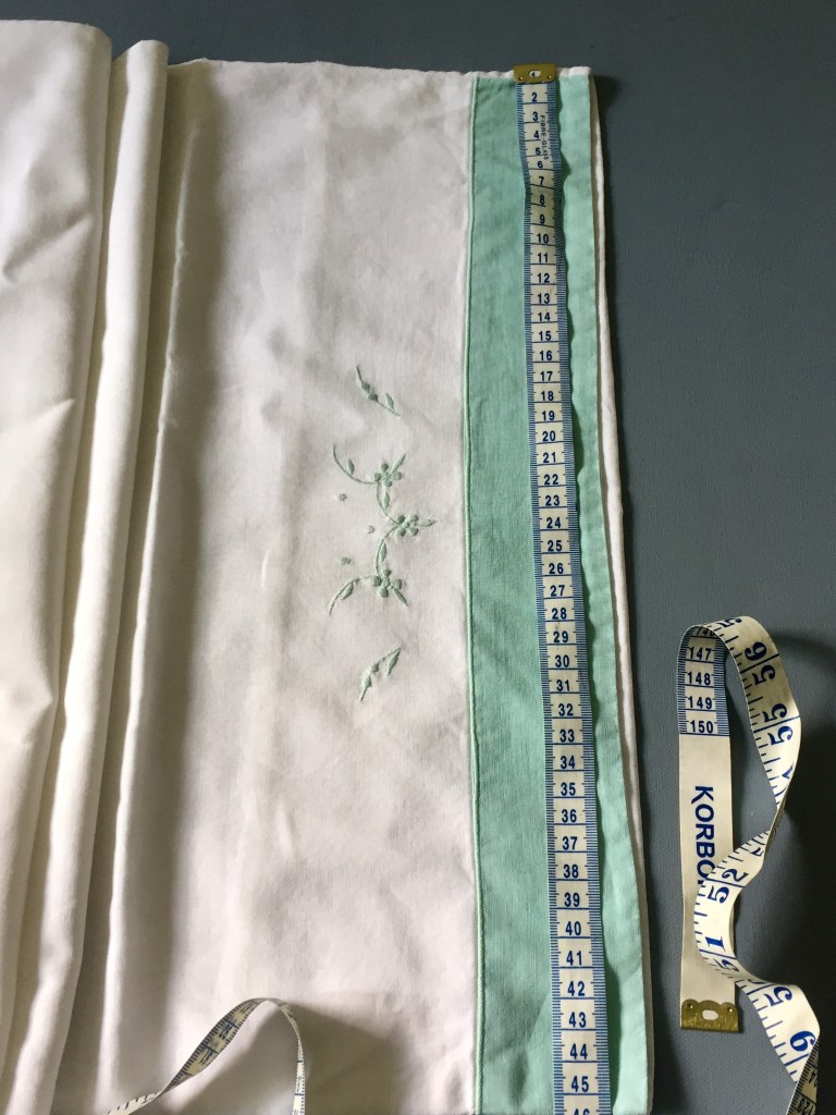 Being in lockdown I reorganised my bed linen and decided to re-use the sheets with holes and to make laundry bags from them. When using sheets with holes and tears you will find that where the rips are, usually in the center of the sheet or duvet, the fabric is thinner. Use the thicker fabric at the edge of the sheet for bag making. When using an old sheet, rather than a pillowcase, you don’t have the time consuming step of unpicking the flap. I have used sports laces as cords as they are easy to come by Korbond sell them in supermarkets so they can be bought alongside your groceries. As laces have rigged ends they are simple to push through a casing, however a large safety pin will speed up the process.