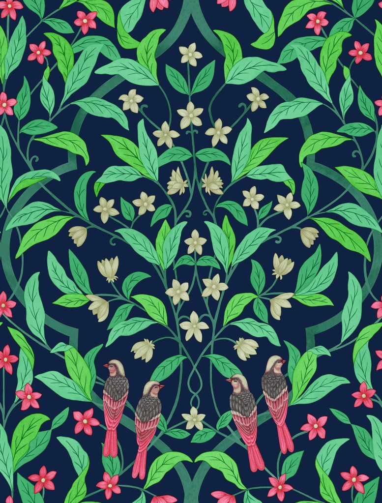 At once sprawling and serene, Jasmine & Serin Symphony is a contemporary update of a graceful Arts and Crafts-style print.