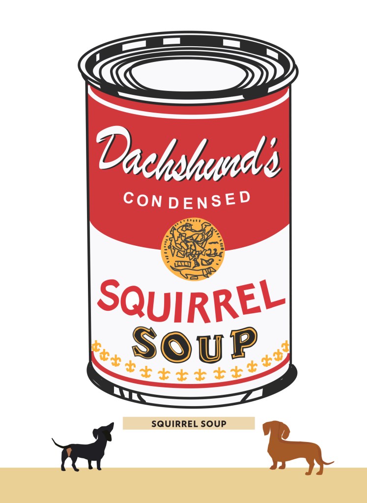They lead their gang of hounds – including schnauzers, jack russells, greyhounds, border terriers, Labradors and more on an eventful trip through the gallery, taking in modern masterpieces and much loved Old Masters. On their way they encounter Whistler’s Mother, Picasso’s The Dream, Matisse’s The Fall of Icarus and a Dachshund Pollack – all culminating in a doggy version of Campbell’s Soup, Warhol’s Squirrel Soup for dogs! Joy has cleverly used the Squirrel soup with all its colour combinations as the books end papers. They look wonderful and would make a brilliant wrapping paper. Well we can but ask.