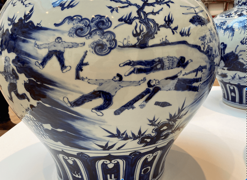 Aie Wiewei, with a nod to the vessels that Grayson Perry produced when he won the Turner Prize, has created large blue and white Chinese style porcelain vases, look closely and you see not the traditional idyllic images of cherry blossom and exotic birds but instead scenes of war, refugee camps and bodies.