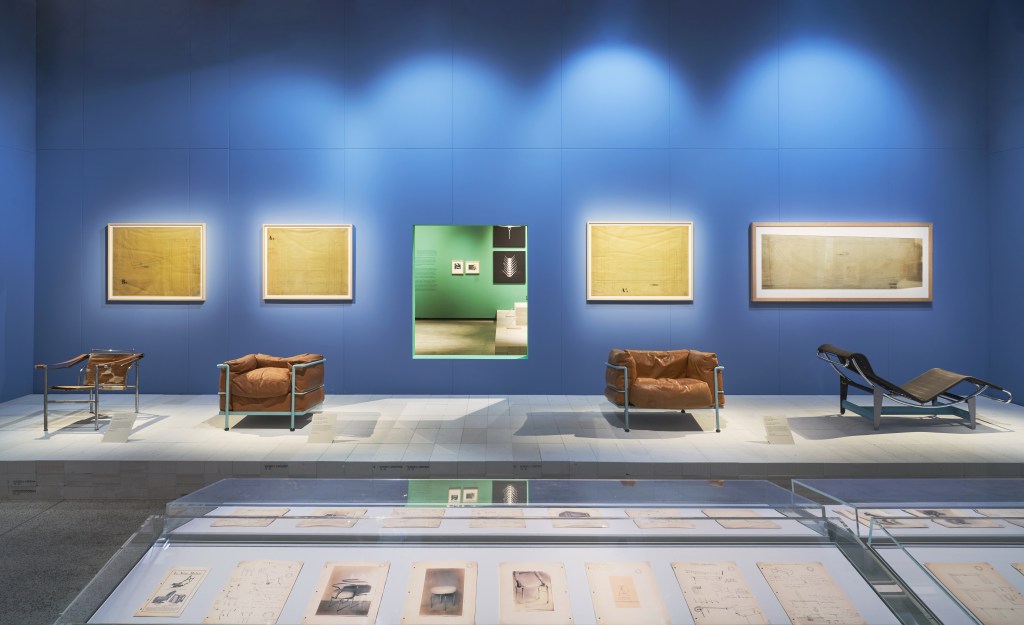 In 1928 Perriand, who at the time was working for Corbusier, designed three chairs from his principles that the chair was a “machine for sitting,” and that each of the three would accommodate different positions for different tasks. At his request, a chair was made for conversation: the B301 sling back chair; another for relaxation: the LC2 Grand Comfort Chair and the last and best known, for sleeping: the B306 chaise longue. The chairs had tubular steel frames. In the prototype models, the steel was painted; in production the steel tubes were nickel- or chromium-plated. Examples of these designs including the full scale drawings by Perriand, are on show at this new exhibition.